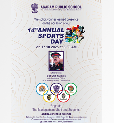 Agaram Public School, established in 2012 is the leading CBSE affiliated, Co-educational, Residential cum Day school in Dharapuram, Tirupur District of Tamilnadu. The school imparts holistic curriculum, to meet the educational needs of students in 21st Century from Pre-KG to XII standard. Set in a serene and green campus that is spread over 20 acres, the school is located on the Karur Main Road, Dharapuram. The school holds the reputation for offering high quality wholesome education to the students community.